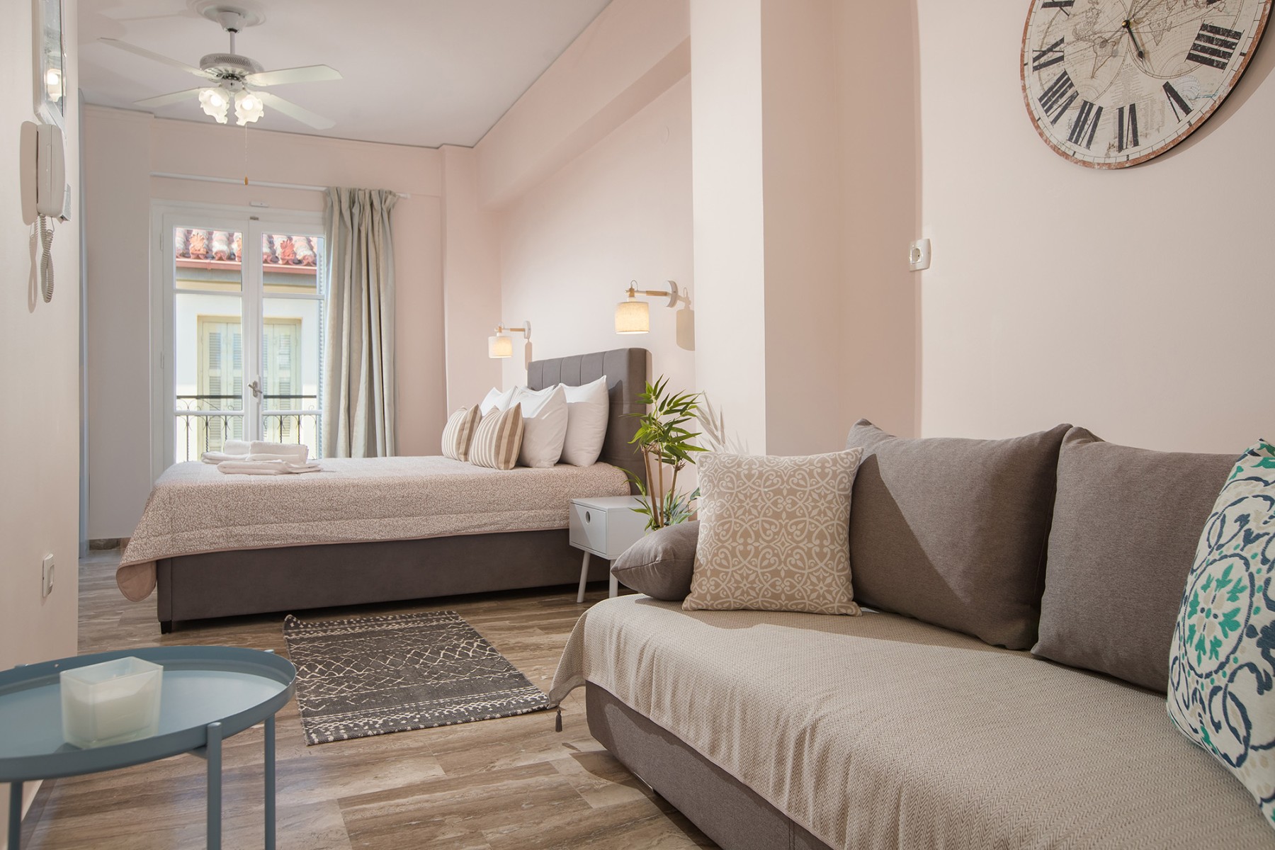 Second floor apartment in the old town of Nafplio with double bed and sofa bed for 1 extra person (on request). Equipped with kitchen, balcony and window for hygienic air ventilation. A/C, Smart TV with Netflix, ceiling fan, safe deposit box, bathroom with shower. Sofa bed for 1 additional person.